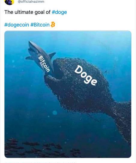 用戶@officialnazimm則發了一張圖,成千上萬個狗狗幣組成了一條大魚,吞了一條名為「比特幣」的小魚,并配文:“狗狗幣的終極目標。”