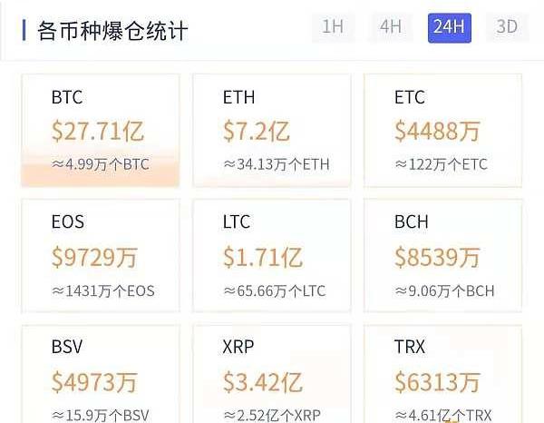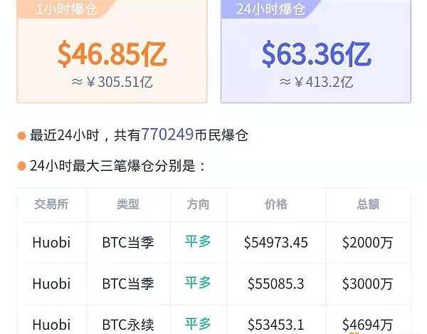 據合約帝數據顯示,合約市場僅1小時爆倉就達到46.85億美元,24小時爆倉額達到63.36億美元,多頭爆倉達到56.64億美元,其中BTC爆倉27.71億美元,ETH爆倉7.2億美元,XRP爆倉3.42億美元,爆倉用戶超過77萬人。