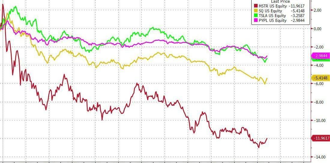 開展比特幣相關業務或投資比特幣的公司周三當天齊跌,特斯拉跌近4%,Square、PayPal、MicroStrategy分別收跌逾5%、近3%和逾13%。美股區塊鏈概念股中,周三僅Coinbase一枝獨秀。