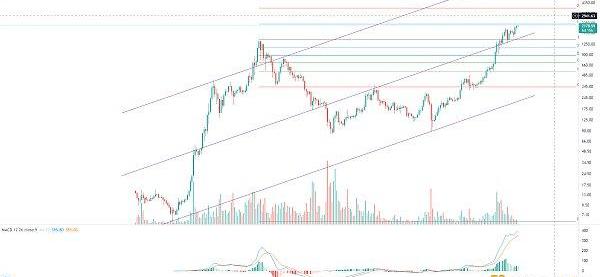 走勢延續多頭趨勢,短線支撐230美金,后續有望向300美金一帶發起沖擊,有耐心的持有。