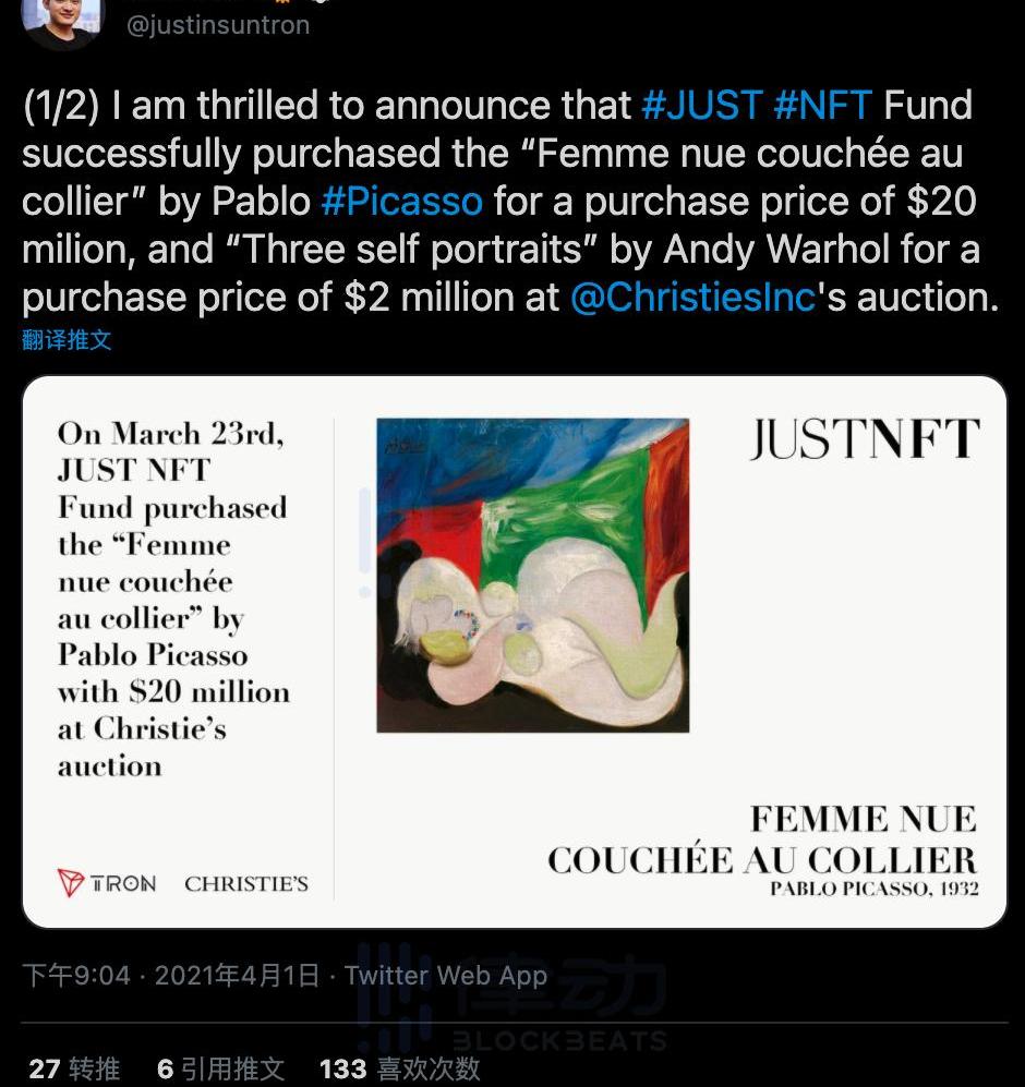 說回到文章開頭,2021年4月1日,孫宇晨創辦的JUSTNFT基金在倫敦佳士得20世紀藝術晚間拍賣以2000萬美元的價格拍下畢加索名作《戴項鏈的躺臥裸女》。同時,JUSTNFT基金還以200萬美元的價格拍下美國藝術家安迪?沃霍爾的《三幅自畫像》。