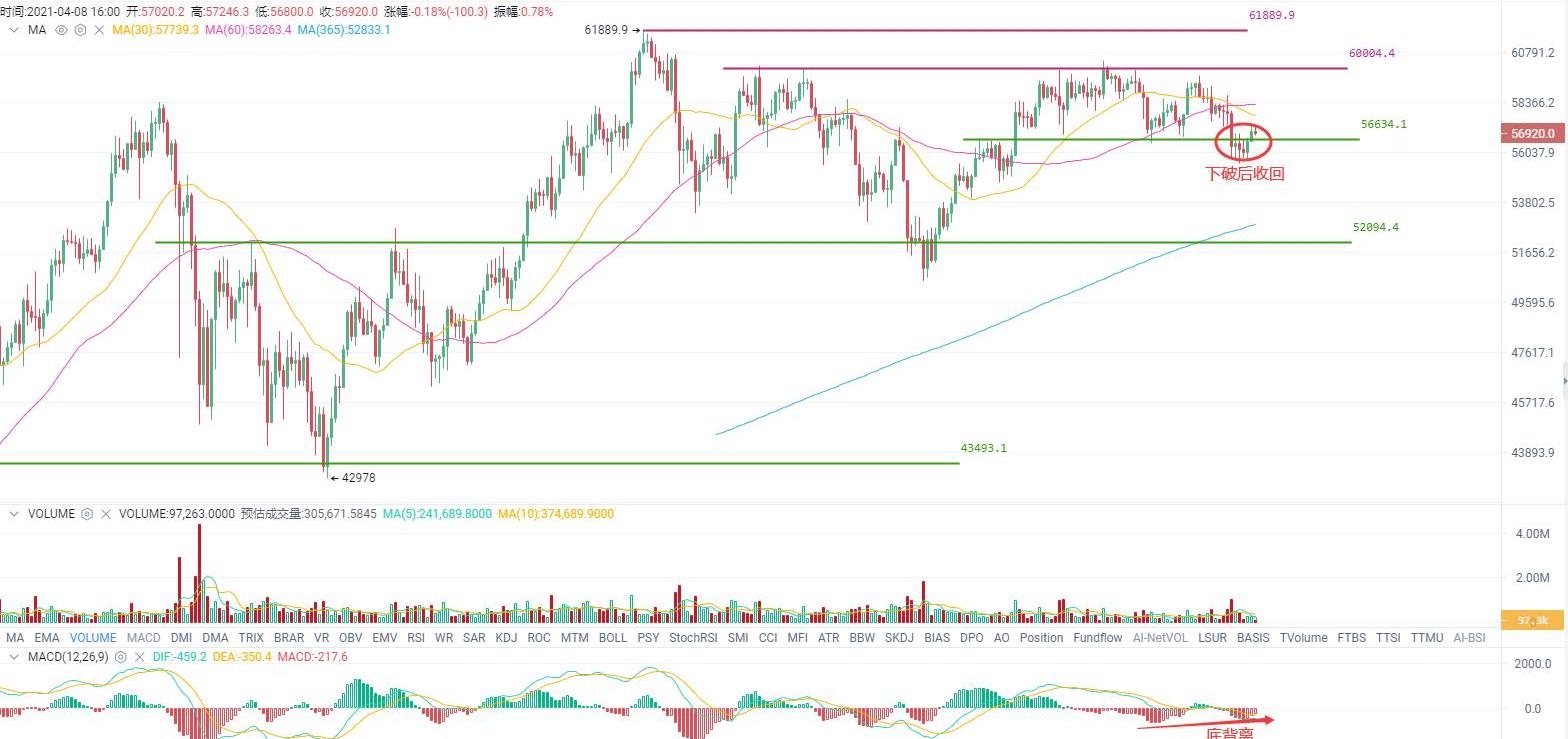二級市場:昨天幣價全天震蕩下行,并且跌破56600一線,該價位是4月初的回落低點,隨后價格出現了回升。在下破后幣價并沒有持續下跌,而是在靠近56600附近的區域徘徊,成交量也未進一步放大。從動能指標MACD來看,本輪下跌出現了底背離現象。