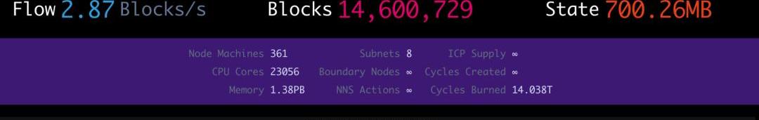 根據當前Dfinity的ICP面板統計,有8個自網絡,361臺節點機器,當前的CPU數量達到了23056個,產生了1460萬個區塊,按照網站顯示,平均而言出塊速度是每秒2.87個區塊。