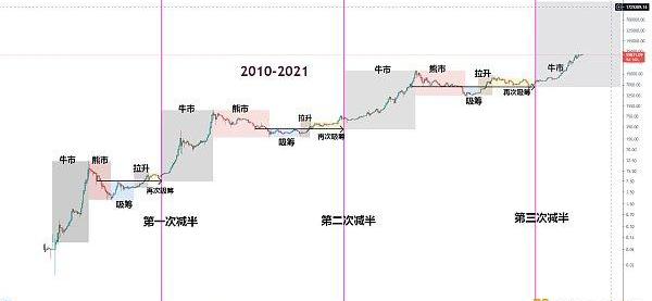 上圖為BTC?2010-2020年這10年周期的長期周線走勢,目前BTC已經完成了三次獎勵減半,我們從圖中可以發現,每一輪減半周期時間內,BTC走勢都包括大牛市、熊市、底部區間吸籌、小牛拉升階段、觸頂回路再次吸籌階段以及之后的新一輪牛市行情的開始,這在BTC2010-2013年第一次減半周期、2013-2016年第二次減半周期和2016-2020年第三次減半周期均得到驗證,歷史不會簡單重復,但總是驚人相似,但BTC市場的規律特色一直沒有改變,只是每個不同時期這些具體的特點稍有細微變化而已。