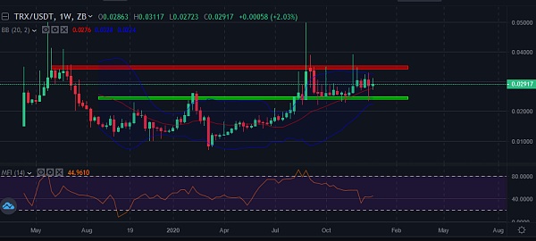 上周初TRX價格強勁看跌,阻力位在0.0315美元。這導致TRX價格在12月23日跌至周低點0.0237美元。