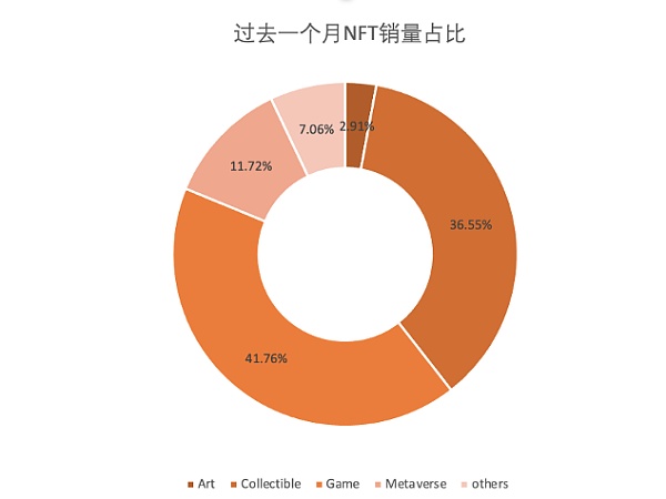 NFTs美元交易額在2018年飛速上漲至$159m,增長201%。但在2019年有小幅下降(4%)至$152m。2020年預計增長64%至$250m。根據NonFungible,在過去的一個月中,NFT銷量為75381;交易量為8,841,559.32美元,僅相當于ETH 24小時交易量的0.03%。從銷量和交易量占比來看,藝術品、收藏品與游戲(包括收集類和虛擬世界類)是目前NFT落地與應用的最主要場景。