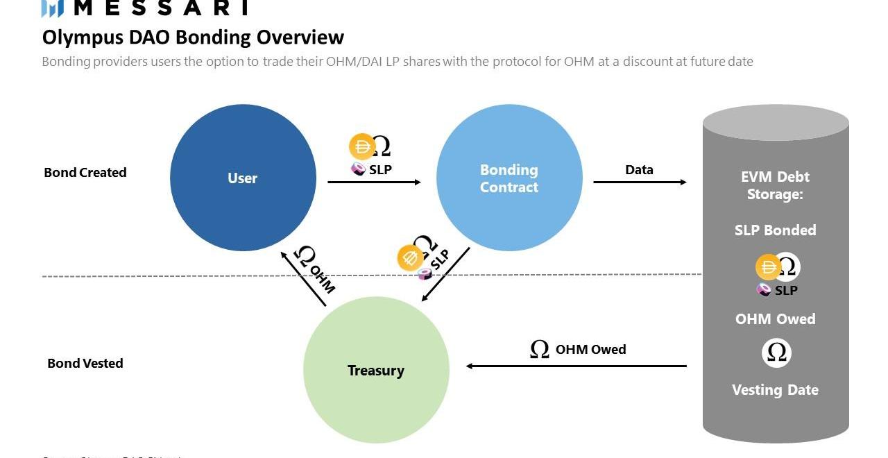OlympusDAO的核心是協議控制值(PCV)、市場運作和債券。OlympusDAO維持著一個最終為OHM提供價格底線的資金庫。它是通過銷售OHM和利用其現有資產產生收益的機會建立起來的。當OHM交易價格高于1DAI時,協議將發行和出售新的OHM。當OHM交易低于1DAI時,協議買回并燒毀OHM。在每一種情況下,協議都會獲得利潤,因為它它可以收到多于1個DAI的銷售費用或少于1個DAI的購買費用。OlympusDAO將這些利潤的90%按比例分配給OHM參與者,10%分配給DAO。