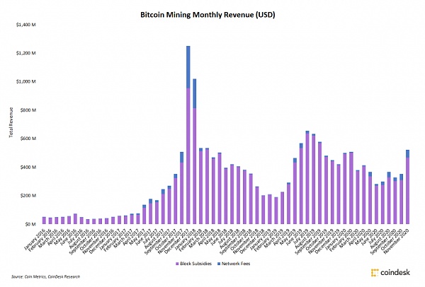 比特幣網絡費用在11月份帶來了5490萬美元的收入,占總收入的近11%,與10月份費用所占收入的12.2%相比略有下降。