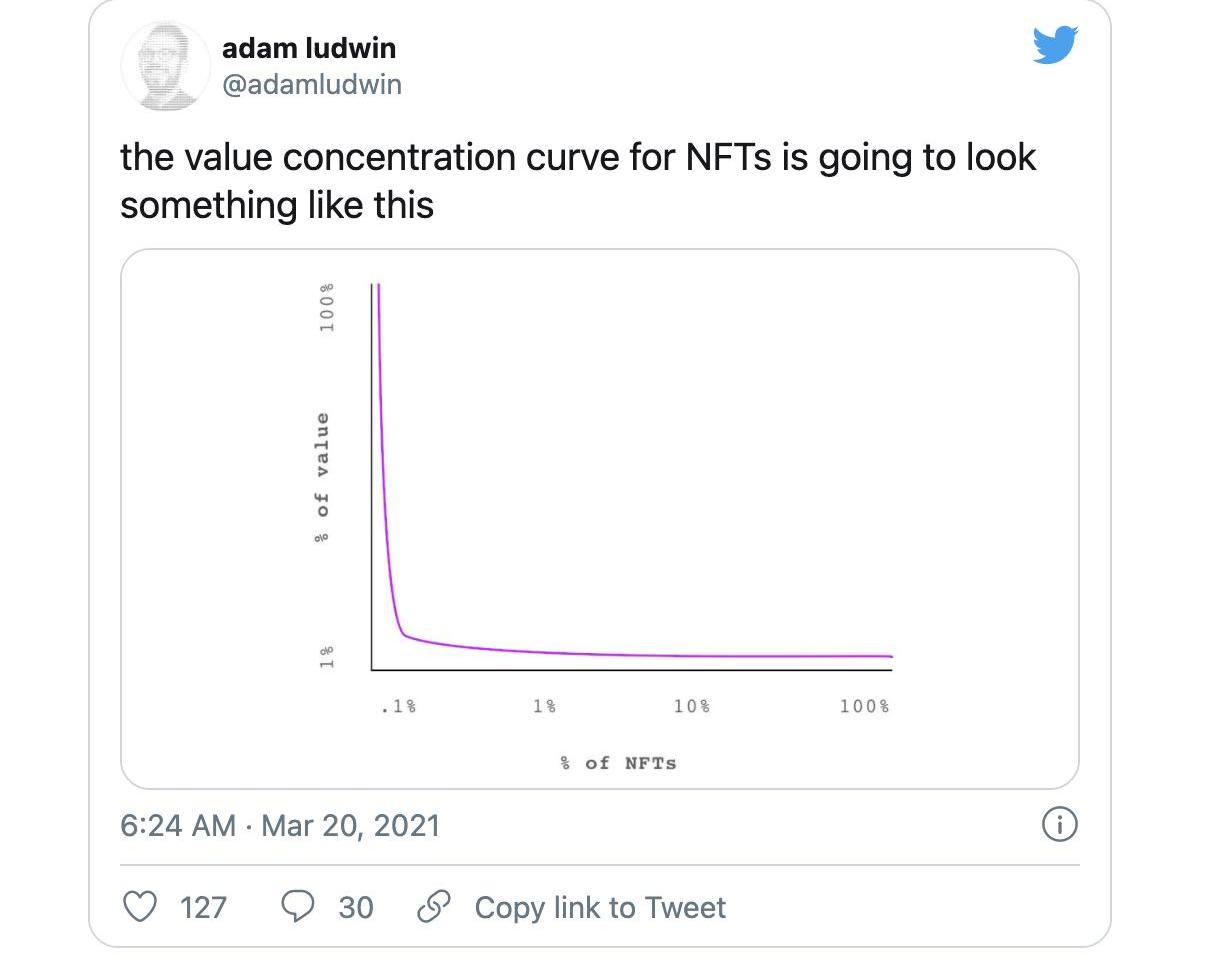 一小部分的NFT占據了絕大多數價值。以OnlyFans或Medium為例,排名前10%的創作者將占價值的90%。