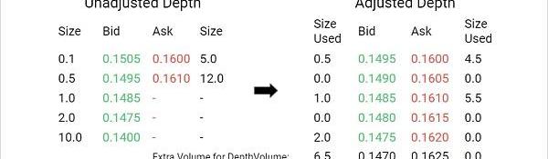 只從深度的頂部水平移除0.5交易量。如果頂部水平只有0.5或更少的交易量,則將下一水平作為第一水平。共使用5個級別,包括第一水平。這是通過使用第一水平的價格,并創建4個額外的水平,每個水平在前一個水平之后創建1個tick。然后將來自市場的交易量與這些價格水平相匹配,直到達到10BTC交易量的累計規模。如果這些級別上的總交易量小于10BTC,則用剩余的交易量再創建1個后面的水平,使其達到10BTC。