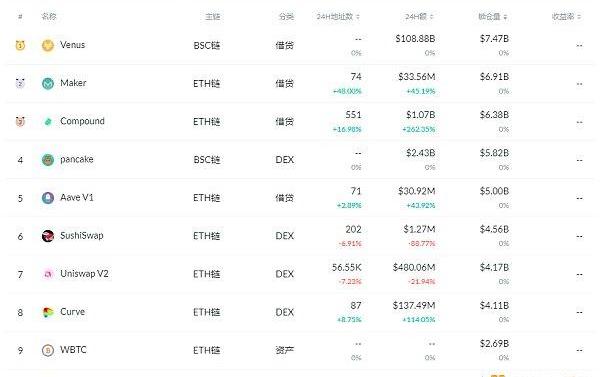 DeFi項目鎖定資產前十排名及鎖倉量,數據來源:Debank