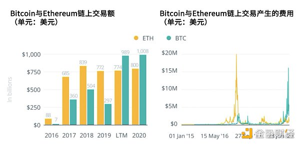 雖然同期Bitcoin 的鏈上交易也有所增漲,但因為Ethereum 才是DeFi 業務真正發生的場所,Bitcoin 的重要性被反超。Ethereum 在處理交易額于2020 年首次超越BTC 并成為第一個處理超過萬億美金的區塊鏈,通常Ethereum 產生的手續費已成倍與Bitocin。