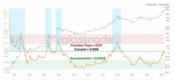 下圖為儲備風險震蕩指標,目前的數值為0.008,以往高于此數值的周期以藍色突出顯示。過去的周期頂部通常發生在大于0.02的值。