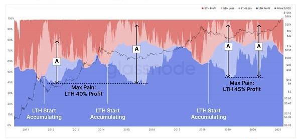 在A階段,只有40%到45%的LTH幣處于盈利狀態,這代表著最大的痛苦,直到觸底發生。