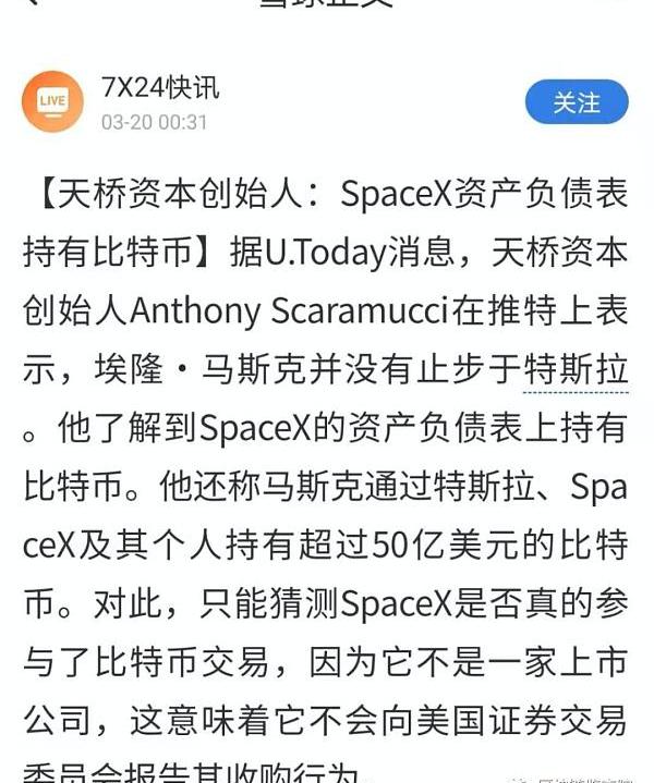 2017年11月,SpaceX的一位前實習生表示,馬斯克可能就是比特幣的匿名發明者中本聰。不過,馬斯克很快否認了這一說法,并且透露,自己只持有朋友之前轉給他的少量BTC。