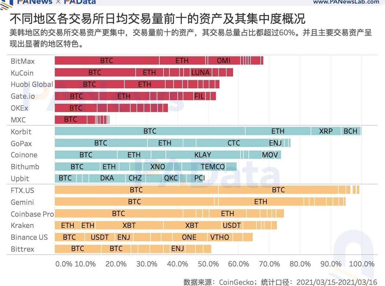 PAData根據CoinGecko為交易所劃分的所屬地區,以及交易所的地區市場聲量和主要用戶所屬地區,選擇了中美韓三國共17個交易所進行觀察,深度分析了近期交易數據后發現:
