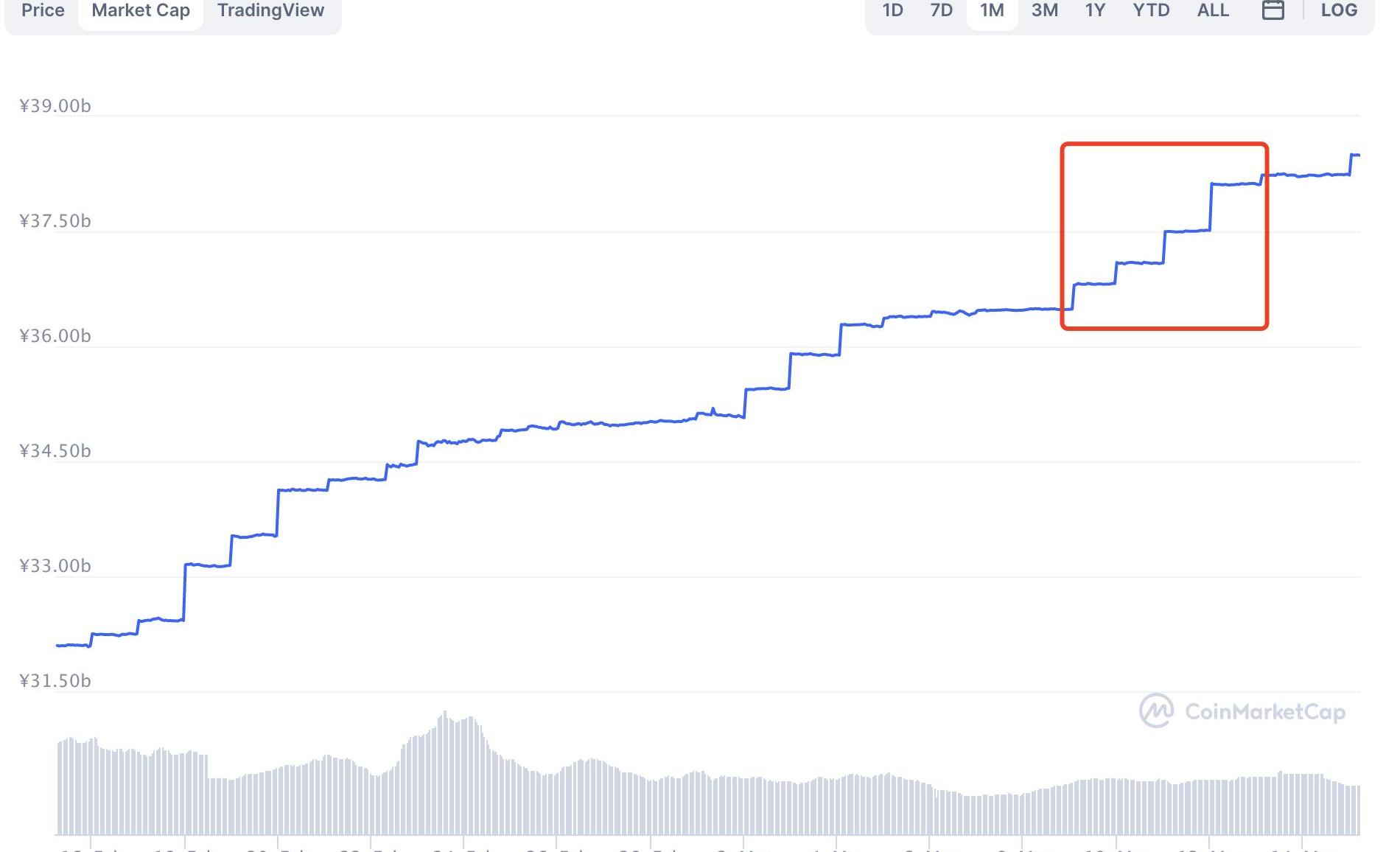 事實上,此輪行情爆發之前,USDT就一直在增發。CoinMarketCap數據顯示,3月9日早間,USDT的總市值約為364.85億美元,在經歷了連續幾天的增發之后,3月12日早間,USDT的總量已經超過381億美元,幾天時間增加了約16億美元。USDT的數據似乎也在印證這一情況。