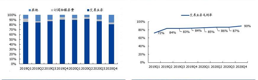 Coinbase的營業收入結構較為穩定,2019Q1~2020Q4營收中的81~92%來自交易業務,2~7%來自訂閱和服務費,4~15%來自其他業務。其中,交易業務收入規模與比特幣和加密資產行情正相關。另外,交易業務的毛利率穩中有升,2020年均在85%以上。