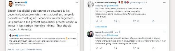 “比特幣就像數字黃金不會貶值,它是去中心化的,能促進跨國交易,并且為經濟管理不善提供風險對沖。讓我們發展這個行業吧,保護消費者、防止濫用、投資碳排放更少的比特幣挖礦吧。美國應該這么做。”RoKhanna于上周三在一條推文中寫道。