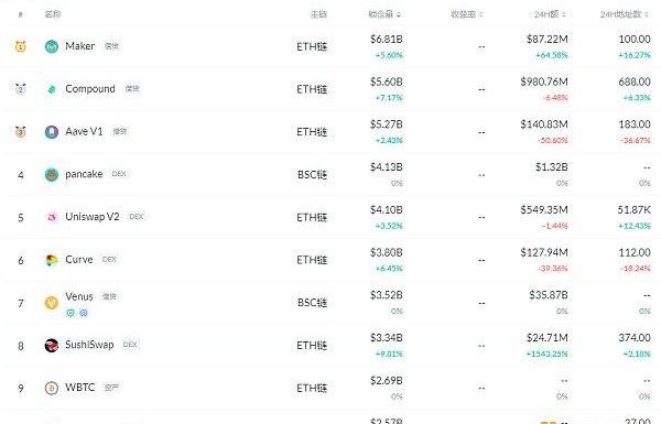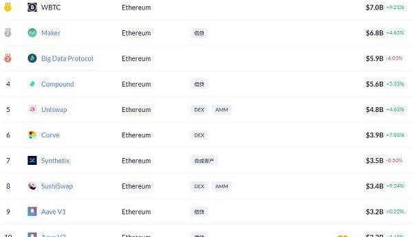 DeFi項目鎖定資產前十排名及鎖倉量,數據來源:Debank
