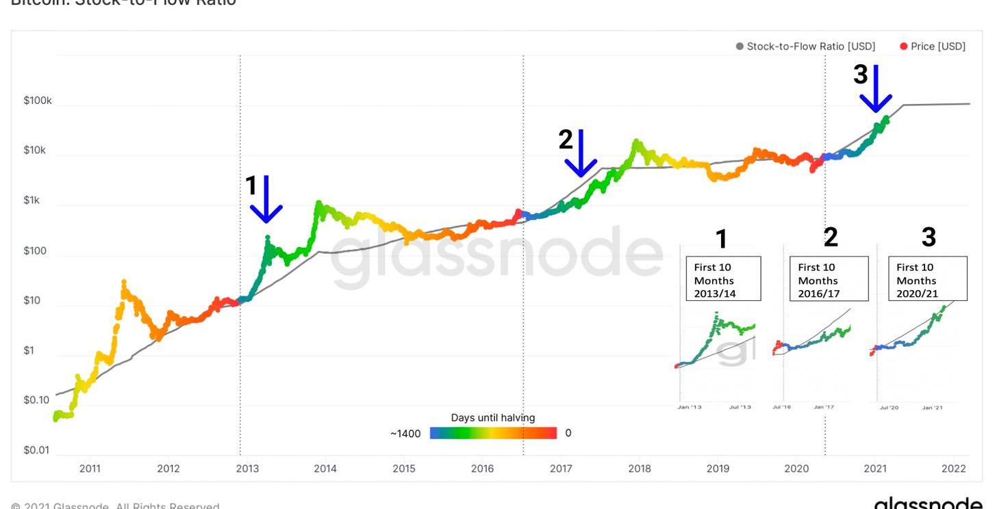 比特幣供應的大幅減少與需求增加的凈效應導致其價格的上漲,這一點很好理解。自2020年3月以來,比特幣的價格已經上漲了10倍,并將比特幣的價格推到了萬億美元以上,這是前所未有的。而當你從“S2F模型”的角度來看,很明顯我們目前的價格上漲有些過早。而從結構的層面上來看,本輪牛市的增長與2017年相比更接近于2013年。