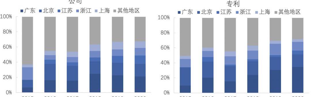 從歷年專利申請情況來看,這種集中度分布情況正在愈演愈烈。從2016-2020年,每年超過50%的公司來自這3個地區,并且這3個地區每年專利數量占比均在55%以上。其中,在2020年,68%的公司、72%的專利來自這些地區。