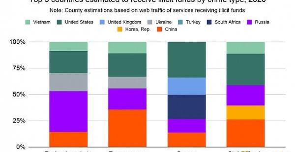 根據接收這些資金的服務的用戶位置的細分,以下國家從非法地址接收的加密貨幣數量最高: