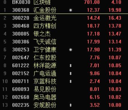 受此消息刺激,A股區塊鏈概念股開盤大漲,匯金股份大漲20%,四方精創、飛天誠信均漲超10%,銀之杰、易見股份、奧馬電器、深科技等逾10股漲停。