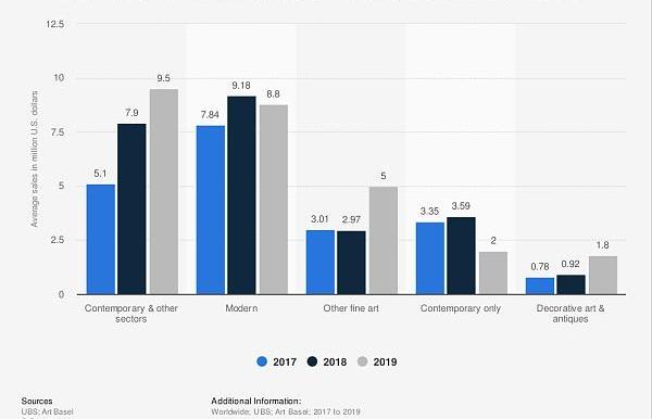 應用藝術和美術的種類繁多,從傳統的雕塑、繪畫到電影、攝影、平面設計、表演、動畫,甚至電子游戲。2017年至2019年,全球各行業藝術品的平均銷售額如下圖1所示。