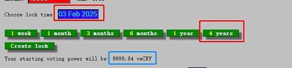 10000USDT選擇鎖倉四年,得到veCRV為9999.84。