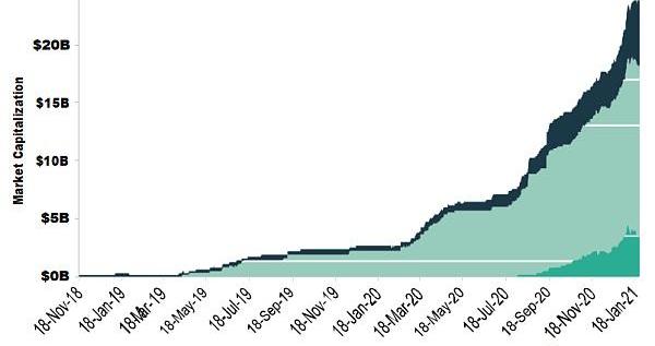 我們可以將以太坊網絡上收取的每日交易費用總額作為衡量需求的標準,如下圖所示。由于ETH是用來支付這些費用的商品,高交易費推高對ETH的需求,好比旅游熱會推高對汽油的需求。值得注意的是,2021年一月的總交易費用差不多達到2018年一月高峰期交易費用的5倍。而ETH的價格也幾乎接近于2018年的峰值。