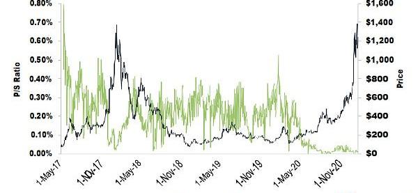 交易費是在以太坊網絡上用于支付交易的總額。另一個評價ETH價值的方法是把以太坊的歷史價格與網絡上的銷售(費用)進行比較。下方的圖表用“價格與銷售額”比率來說明這種關系——比率越低,說明網絡產生的收入相對于ETH的歷史市值來說越高,因此可能是被低估了。