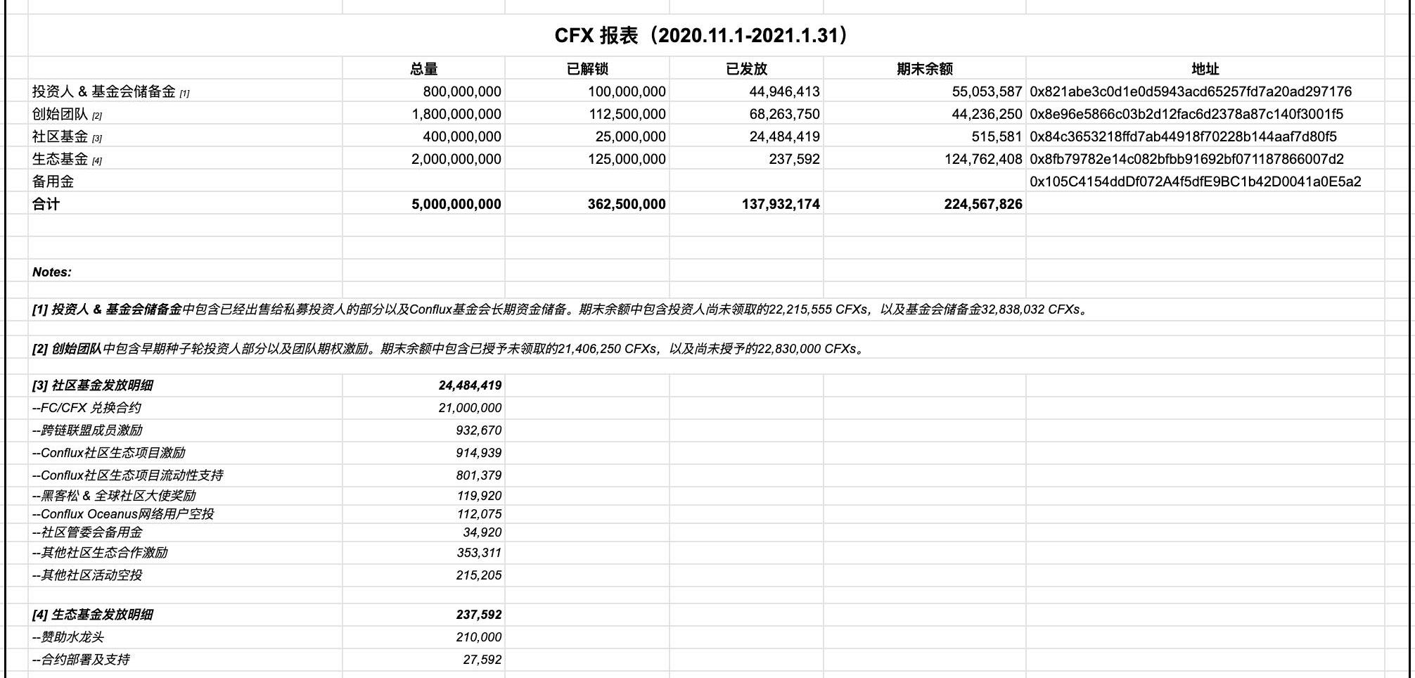 此外,歸屬于生態基金的2,000,000,000枚CFX,目前已解鎖6.25%,共發放了其中的0.01%,本期末余額124,762,408枚。