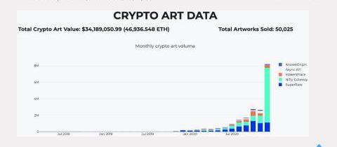 我們可以看下各個加密藝術平臺的拍賣量,2020年6月之前,交易量其實非常小,但是到今年年底的時候一下突破了八百萬,大家可以看到綠色的一下突破了。之前SuperRare平臺一直是行業的老大,但突然NiftyGateway開始暴發,背后的原因主要是雙子星交易所的Winklevoss兄弟買下了NiftyGateway,在該平臺可以用信用卡直接下單,而不僅僅用以太坊來買藝術品。這也是為什么在NiftyGateway入場后,交易量會暴漲六七百萬美元。