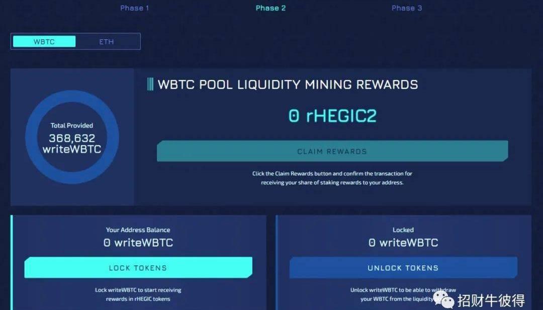 繼續下滑,出現WBTC和ETH鎖定頁面,選擇ETH,然后就可以看到自己兌換的writeETH,數量無誤后,點擊下方的LockTockens,就可以鎖定,鎖定之后,就可以開始收到rHEGIC獎勵,圖示上的數字0就會慢慢開始增長了。