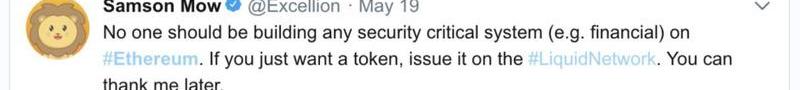 5月19日。BlockstreamCOO繆永權(SamsonMow)曾在Twitter發表評論:“沒有人會在以太坊平臺上構建任何安全系統。如果你想要token,你可以在Liquid網絡上發行,以后你可以感謝我。”