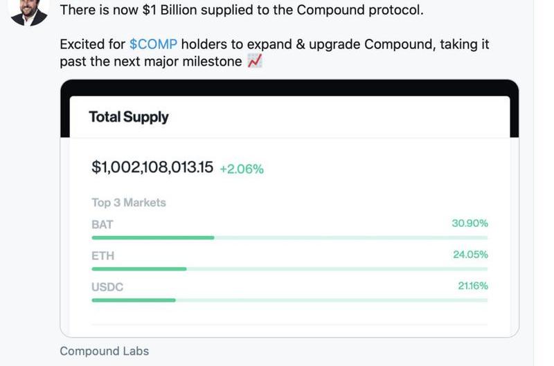 6月27日,Compound的首席執行官RobertLeshner在Twitter上表示,當前已經有10億美元的資金注入到Compound中,他“很高興COMP持有者能夠擴展和升級Compound,使它超越下一個主要里程碑。”同時他也表示使用高風險的資產進行?"Yieldfarming"極其危險。