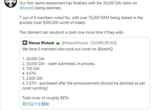 2月16日。去中心化保險協議NexusMutual在推特上公布了6份索賠單評估詳情,并于2月19日支付了首次理賠款。