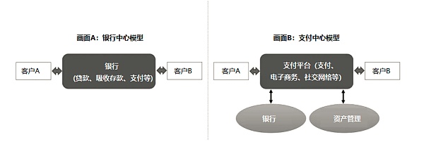 下圖就是普林斯頓大學描述的金融市場大變革,左邊是現在金融市場,以銀行為中心;右邊是未來金融市場,以平臺為中心。