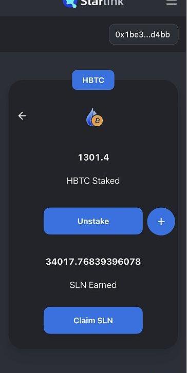 登錄https://pool.starlink.so,選擇對應礦池進行抵押挖礦,StarLink支持SLN/HUSD、BTC/USDT等LP抵押,同時也支持HBTC,HETH,HUSD單幣抵押,其中SLN/HUSD幣對LP挖礦可獲得30x收益。