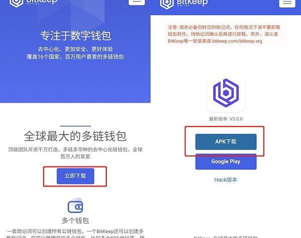 第二步:彈出“Bitkeep錢包安裝包文件”界面,請點擊“立即下載”安裝錢包。下載安裝成功之后請打開Bitkeep錢包APP點擊”開始“!