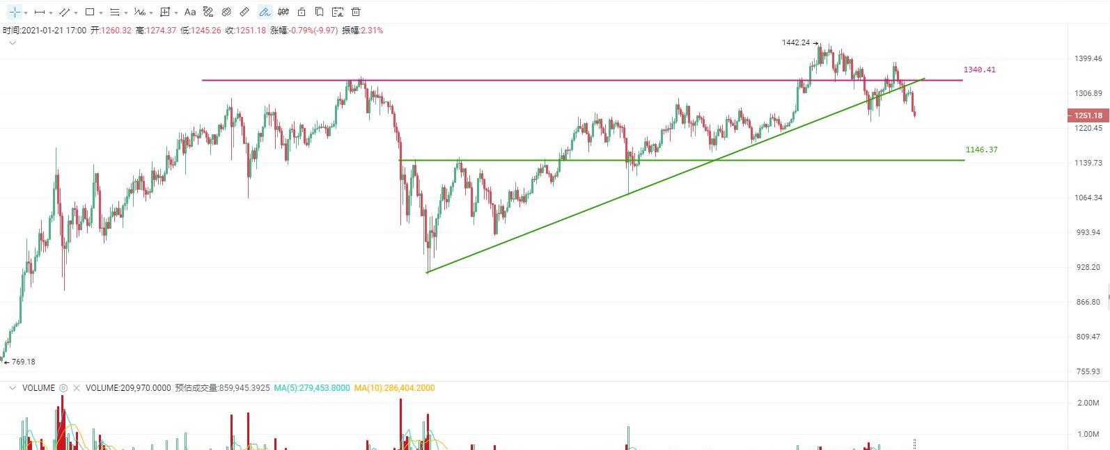 以太坊昨晚最在1340一線短暫止跌后再次向下運行,并且出現短暫下破圖中上升趨勢線的現象,隨后逐步止跌企穩,但在小幅上破1340后再次掉頭向下,目前已經明確跌破上行趨勢線。比特幣和以太坊的這種走勢驗證了市場的短期弱勢情緒。