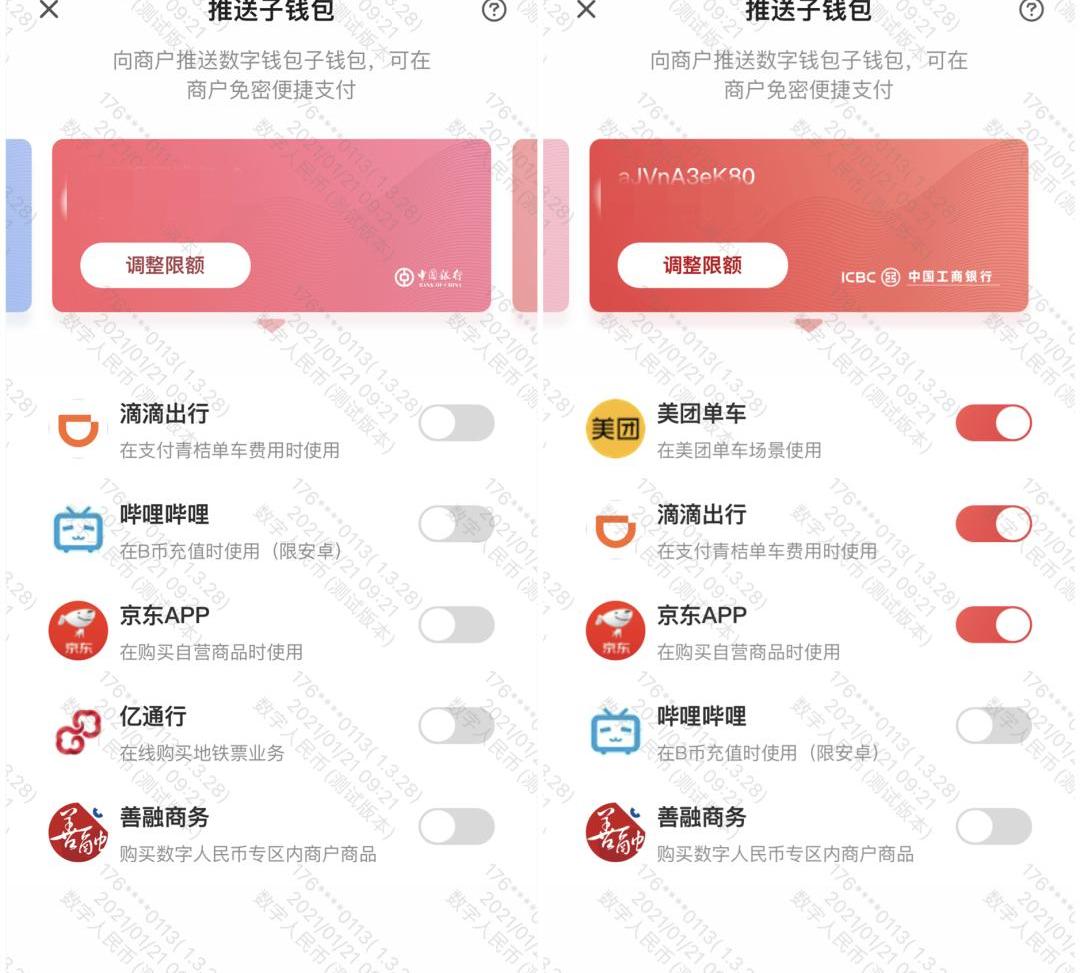 從支持的App推送來看,農行與建行子錢包目前支持4個App推送,分別是滴滴出行、京東App、嗶哩嗶哩、善融商務;郵儲與交行子錢包則支持5個App推送,分別是滴滴出行、嗶哩嗶哩、善融商務、京東App、京喜App;中行與工行子錢包也支持5個App推送,不過除了滴滴出行、嗶哩嗶哩、京東App、善融商務等4個相同的App之外,工行還支持美團單車,而中行則新增了對北京地鐵出行App“億通行”的支持,支持通過數字人民幣在線購買地鐵票業務。