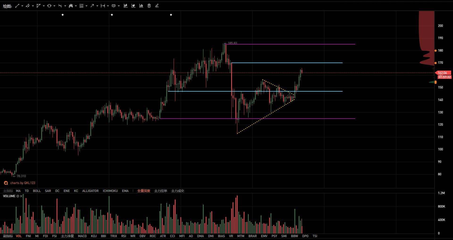如圖所示,萊特幣于昨晚成功突破收斂結構,同時萊特幣也是主流幣中突破收斂結構最早的一個,但后勁稍顯不足。萊特幣短期壓力和支撐分別為170和147附近,中期壓力和支撐關注180和125一線。