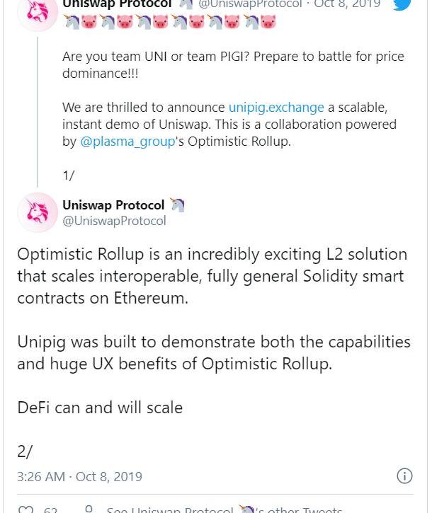 UniswapV3的第一個預期功能是通過使用Layer2的擴容解決方案來實現更快,更便宜的交易。在2019年10月,Uniswap創建了一個交易演示,展示了OptimisticRollups如何擴容交易。它的手續費將低至不到一美分,而交易時間也僅用不到一分鐘。該演示目前已經不再有效,這可能表明Uniswap正在準備將其引入其主要平臺。