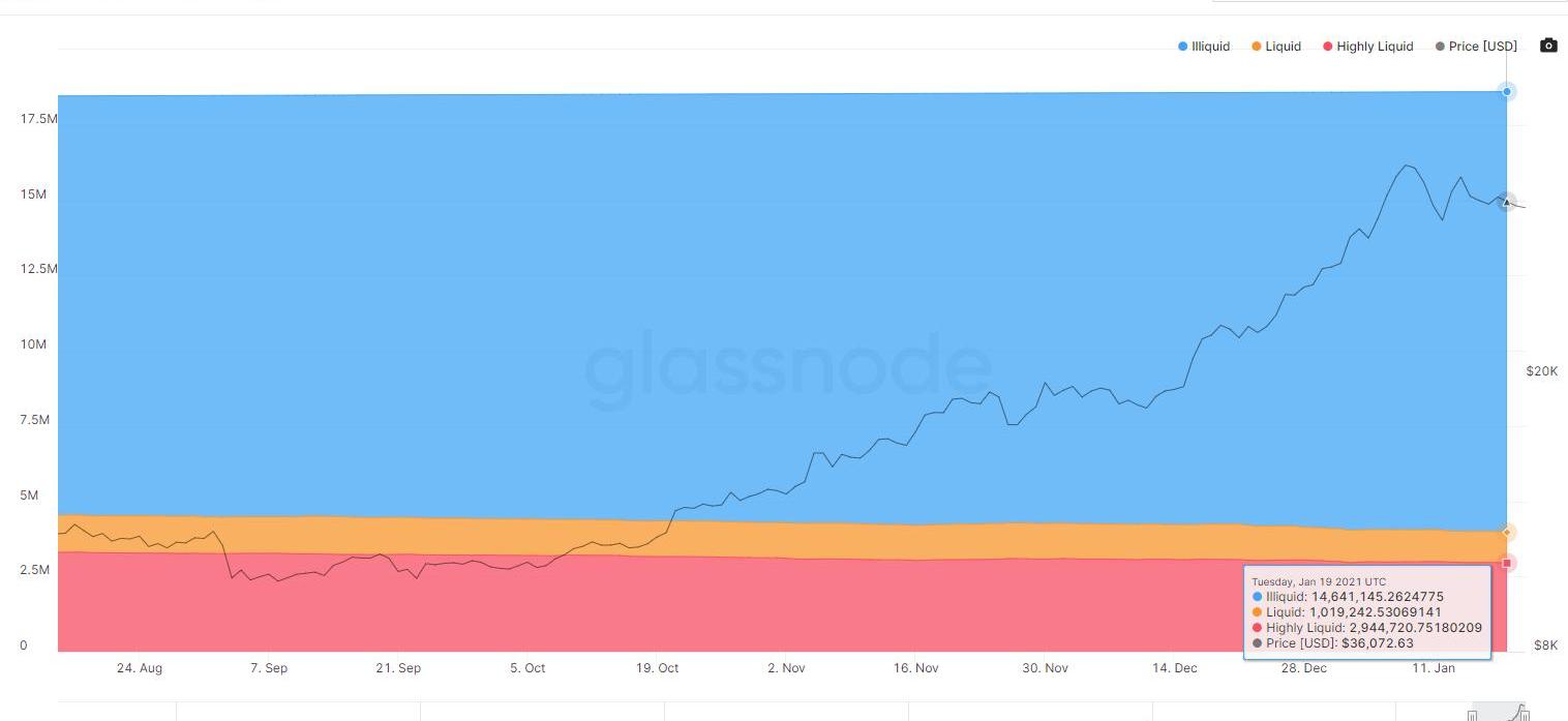 隨著新的散戶和機構交易員爭奪日益減少的供應,比特幣日益減少的流通供應可能對其價格有利。Glassnode估計,在1860萬流通的比特幣中,近80%目前儲存在“非流動性”錢包中。