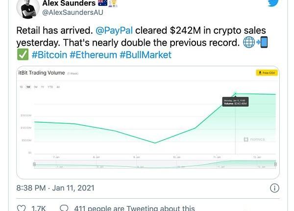 幣圈的推特大VAlexSaunders指出,PayPal昨日單天加密貨幣交易量達到了之前最高紀錄的兩倍,他通過查看由Paxos啟動的機構級加密貨幣交易所itBit的交易量來對PayPal的交易量進行觀察。