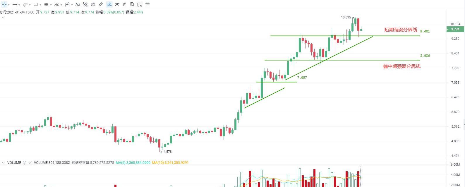 DOT近日同樣保持明顯強勢狀態,自節前晚評后最大漲幅超過20%。目前在10.5一線出現承壓回落現象,從走勢結構上看主要是因為1小時周期里出現頂部背離,不過現在并沒有打破波峰波谷不斷抬高的特征,意味著上漲趨勢沒有破壞。不過剛剛出現的調整有明顯成交量放大跡象,說明市場情緒出現短期恐慌,接下來要密切關注這種放量下跌現象是否會繼續出現,出現則要注意規避短期走勢風險,否則不必過分擔憂。價位上可先重點留意9.4一線,視作短期強弱分界線。