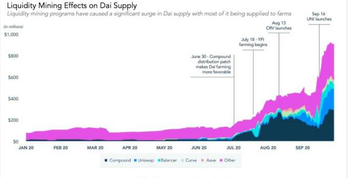 當你可以從質押率更低、質押類型更多、可借資產更多的Compound質押借貸和Aave借貸時,這種情況是如何發生的?作為一家借貸機構,Maker看起來缺乏競爭力,這對Dai來說應該是個壞消息,但事實上,同樣的競爭性借貸協議已經建立了yieldfarms,需要Dai作為其主要的分散質押品選擇之一。有一段時間,流動性挖礦的回報抵消了原本令人望而卻步的成本,創造了新的Dai,這種影響比USDC更加極端。