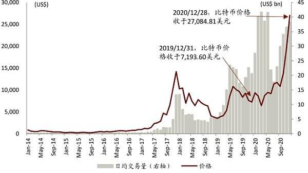 圖表:2014年1月以來比特幣價格及日均交易量